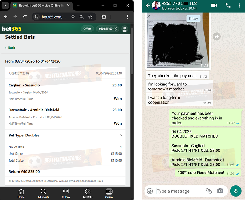 Welcome to best site for real fixed matches. Our Betting Fixed Matches tips are directly from club sources, the win is 100% guaranteed. We offer 3 different bettings (Fixed Match, Vip Combo Ticket and Double Fixed Match) safety is 100 %, our games are not predictions, our tips are manipulated games with known outcome, so you do not need to worry your money are safe 100% betting tips , we do not send any game to our clients if is not 100% fixed game tip. You can see our packages below..